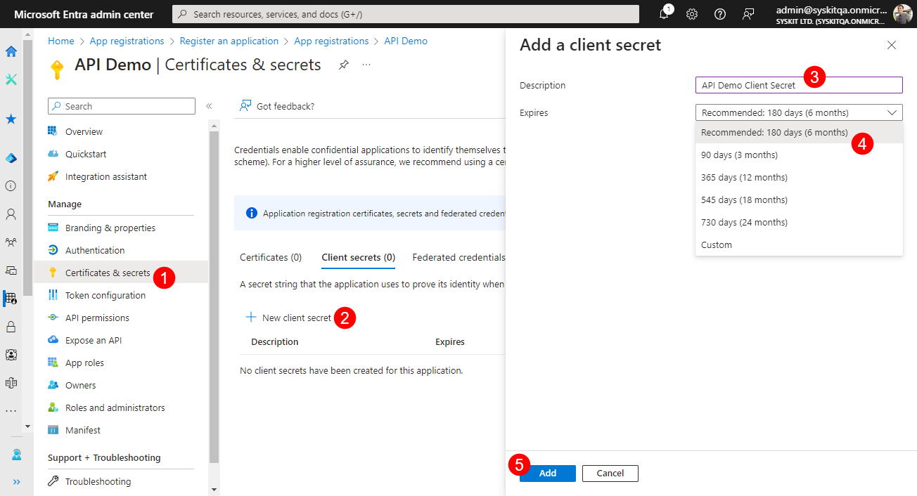 - Click the New client secret option (2) - a sidebar opens where you can: